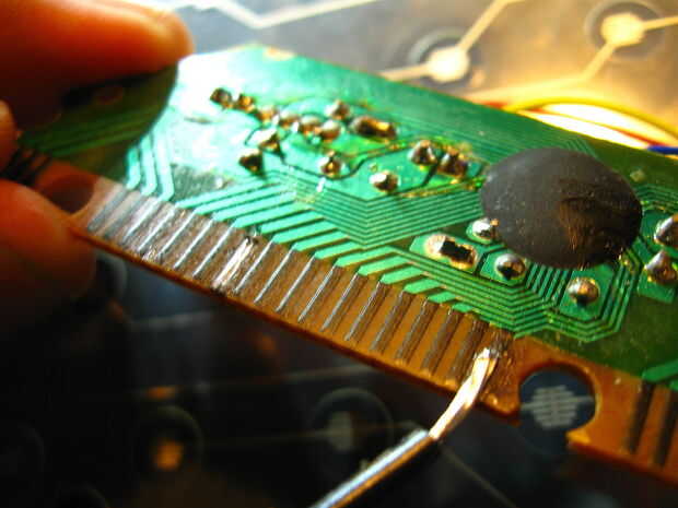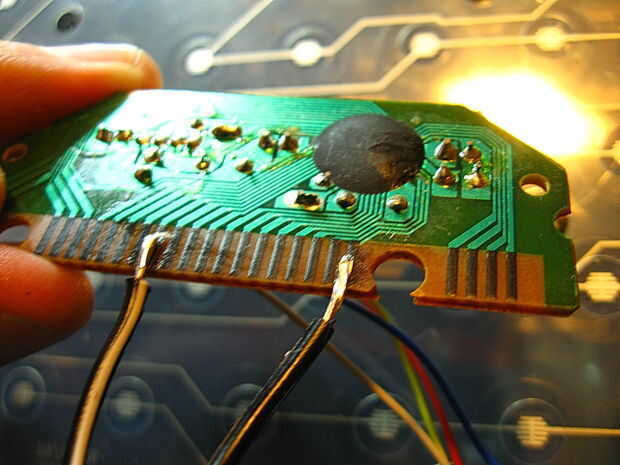 Una vez encontrado los dos pasadores, es el momento de soldar los cables a ellos. La soldadura no pegarse a la placa de circuito a menos que rayar algún material de los pasadores, limpiarlo y pone algún flujo en él. Alguna soldadura en el cable primero y luego soldar el cable con el conector. Los cables a soldar más tarde al interruptor.