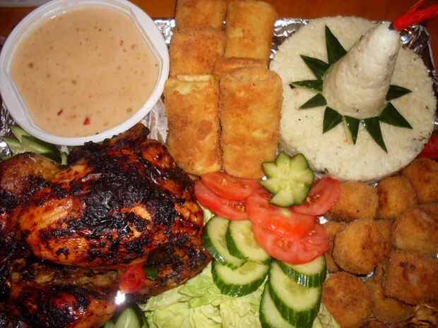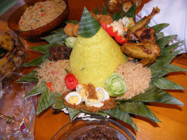 Para plato principal tumpeng, a veces todo a la plancha o pollo frito se añade mientras algunos que otro momento serían trozos de pollo.