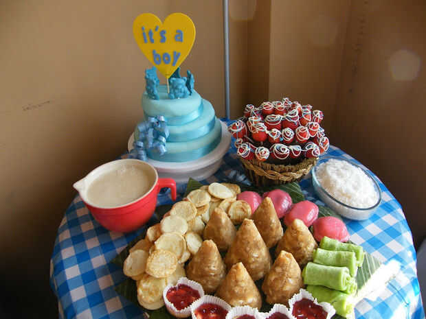 Tumpeng postre principalmente utiliza puré de mandioca o arroz glutinoso (azucarada) como el principal postre en forma de cono, que entonces rodeado de otro tipo de dulces. En mi foto, pueden ver rollo verde pastel (relleno con coco), rosa pastel llamado kue-ku, coco a veces lleno mientras que otras vez con dulce habas, panqueque dólar indonesio llamado serabi y tarta de queso individual en los forros de la Magdalena. Esto es sólo un ejemplo. Otros postres se pueden agregar con seguridad, dependiendo de cuán grande es su plato :)