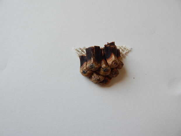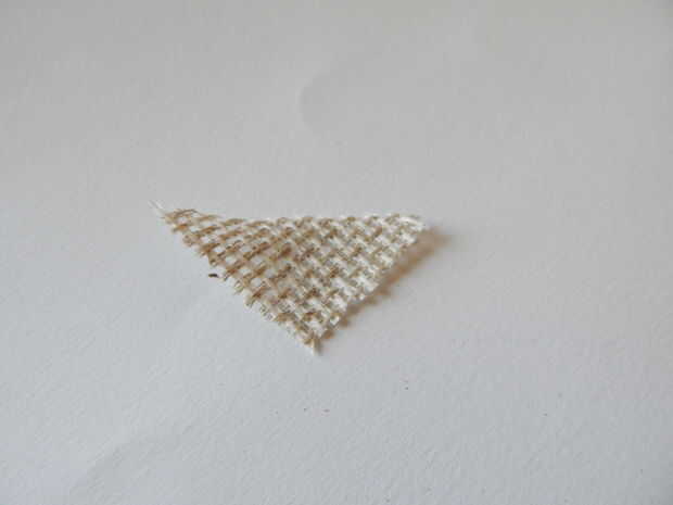 De una especia de tela cortamos un triángulo. Pega sobre un fondo del triángulo tres línea de escamas del cono de pino.