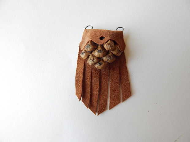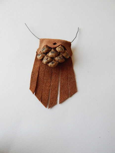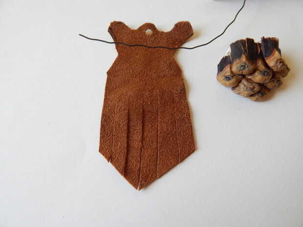 Entre las escalas del cono de pino y cuero ponemos alambre y luego pega el cuero al revés en el triángulo, después de que nos suba los extremos del alambre.