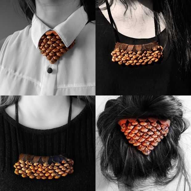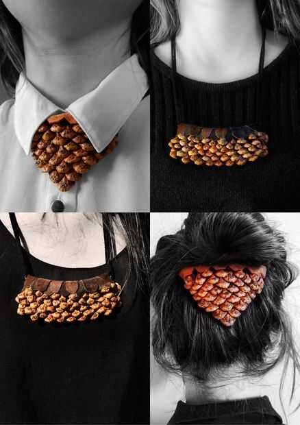 Esta joyería hago de una materia básica natural, el cono de pino. Es un elemento muy bueno, interesante, la pieza del cono de pino, como las fichas se apilan sobre otros.