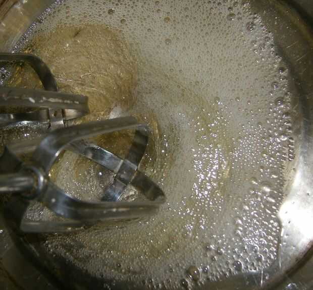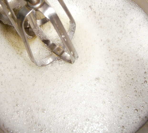 Batir las claras de huevo en un tazón grande hasta que se formen picos suaves y la mezcla es casi todo blanco y burbujeante.