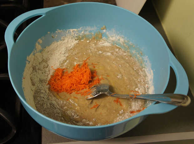 Precalentar el horno a 350 grados f el. Luego, para preparar la pasta de torta de zanahoria, mezcle la mezcla de torta, agua, aceite, huevos y zanahorias ralladas en un bol grande.