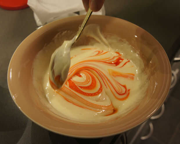 El queso crema glaseado en un recipiente de desecho. Añadir unos 3-4 gotas de colorante naranja y darle un buen revuelo. Llenar una manga pastelera con el glaseado.