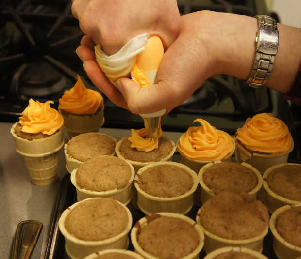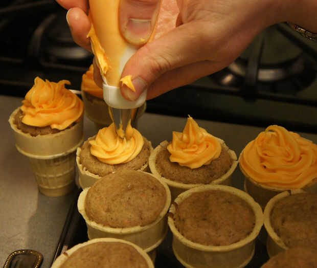 Usando la Manga pastelera, decorar la parte superior de los cupcakes en forma de espiral que se parece a las llamas.