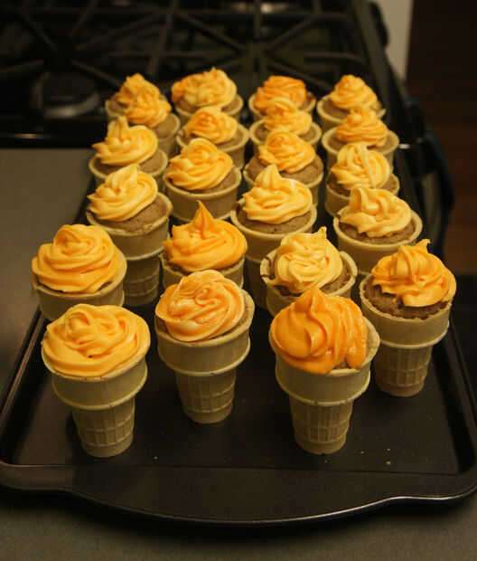Preparar una mezcla de pastel estándar 15,25 oz en caja por instrucciones de la caja.Paso 1: Organizar tus conos para rellenoPor una caja de mezcla para pastel preparada, arreglar 18 conos de helado tipo de pastel en una bandeja para hornear. He sele