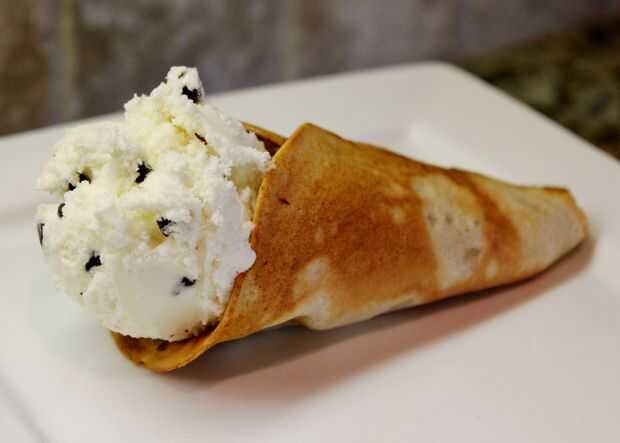 Precaliente su comal a 400 grados. Se mezclan todos los ingredientes en una licuadora hasta combinar bien. Vierta una cucharada de masa en la plancha para hacer un círculo de 6 pulgadas (plano) (inicio con apenas uno por uno hasta llegar bueno). Cocinar hasta que los bordes estén dorados (unos 5 minutos) y voltear para cocinar el segundo lado (2-3 minutos). Retire la plancha a una rejilla para enfriar. Rápidamente forma el círculo en forma de cono, pellizcando el parte inferior el punto para que no escurra el helado. Puede mantener durante 10-20 segundos hasta que se enfríe, o colocar en un embudo (en una taza) para enfriar. Ver las fotos de arriba. Éstos sirven el mismo día que haces.