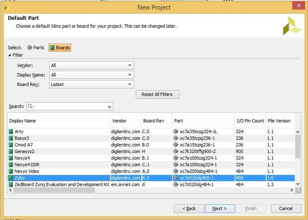 Abra Vivado y cree un nuevo proyecto. No necesita incluir cualquier fuentes existentes o IPs, pero asegúrese de elegir el Zybo en la página de selección de la parte. Si no se presentara, los archivos de la Junta no están instalados correctamente.