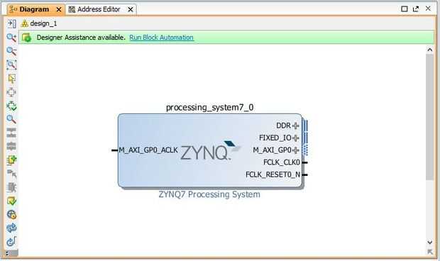 A la izquierda, debajo de Integrador de IP, haga clic en crear bloque diseño. El nombre lo que quieras, siempre y cuando no hay ningún espacio. Haga clic en el botón de Añadir IP amarillo poco visto en medio de su nuevo diseño. El Sistema de procesamiento de ZYNQ7 y añadir a tu diseño.