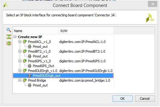A la izquierda de su diseño, haga clic en la ficha directorio haga doble clic en el conector del Pmod que desea PmodOLEDrgb para conectarse. Seleccione la PmodOLEDrgb_v1.0 IP y haga clic en OK.
