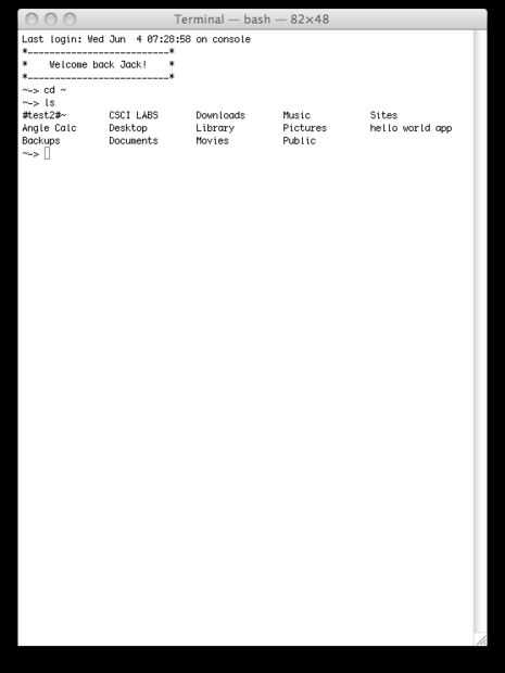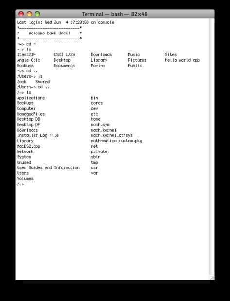 Todos los discos duros internos y externos están en los "volúmenes" directorio así que vamos a llegar allí escribiendo "volúmenes de cd" y entonces el listado otra vez el contenido del directorio. Nombre de tu iPod debe aparecer como uno de los directorios. Mina se llama JACK IPOD. Para conseguir en todo lo que tenemos que hacer es... adivinaron escribe "cd" ipodname"" y estamos en!