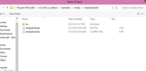 Por último, desplácese hasta la ruta C:\Program Files\of_v0.8.0_vs_release\examples\empty\emptyExample y seleccione emptyExample.sln