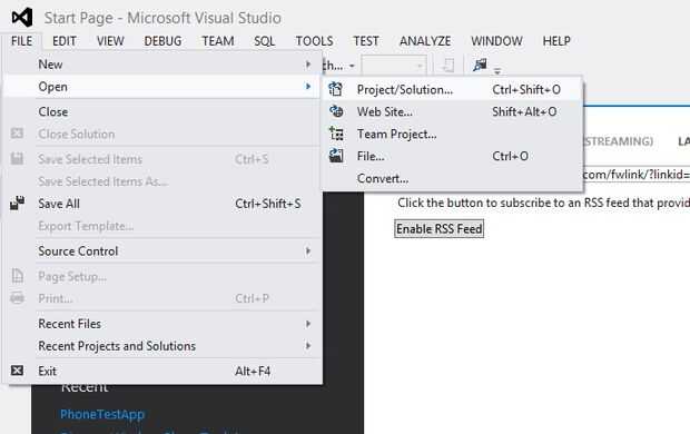 A continuación, haga clic en archivo > Abrir > Proyecto/solución o pulse < Ctrl > + < cambio > + < O >.