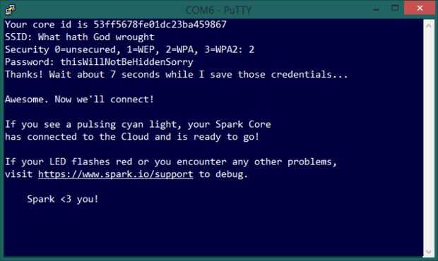 - Volver a la comunicación período de sesiones y tipo 'w'. La base cambiará a una luz azul fija, mientras que la sesión de comunicación pedirá el SSID (que es entre mayúsculas y minúsculas), la seguridad y el contraseña;