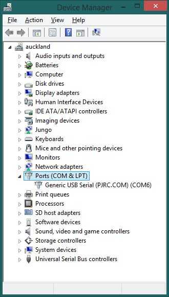 - Ir a los "puertos (COM & LPT)" y gírela abierta si ya no está. Busque la entrada de chispas o "Generic USB Serial" y anote el número de COM.