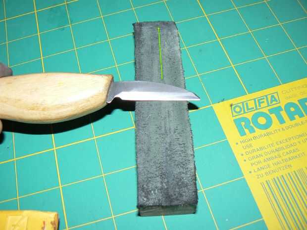 Rubb stropping compuesto en la correa y coloque la hoja en la correa de la misma manera afile pero existe un único método para stropping. Con la cuchilla en el recorrido de la correa de cuero lejos del borde de corte según lo indicado por la flecha verde. Hacer varias pasadas sobre la correa de cuero alternando el lado de la hoja en cada pasada.