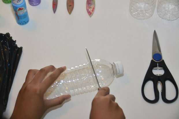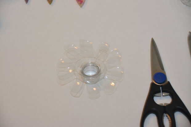 Using su cuchillo, cortó la parte superior del casco de una botella de plástico (la sección con la tapa de la botella). Luego, use sus tijeras para cortar los pétalos. Doblar los pétalos hacia abajo.