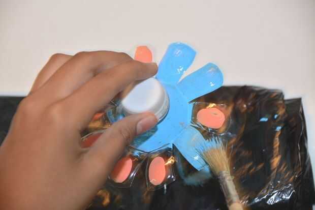Flabios una flor encima y pintar la parte inferior de los pétalos. Repita esto con cada flor de plástico.