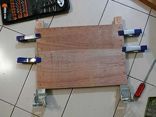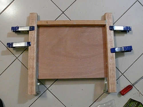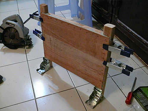 Las piernas son valores de 2 x 2, y sujeté con el hardware de pata plegable que se muestra en algunas de las fotos. El hardware es inteligente; encaje abierto y cerrado, con un pestillo que sostiene en posición sobre las pestañas. Costo fue de unos US$ 16 el par. La escuadra de madera contrachapada mantiene las piernas estables. No hay tormento.