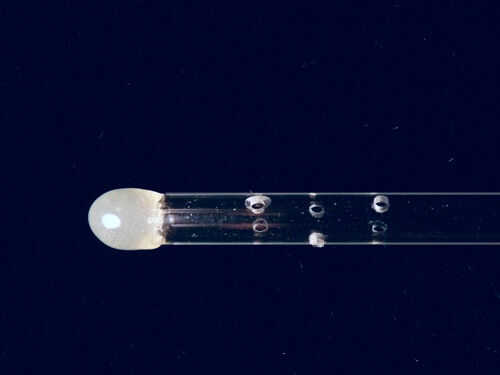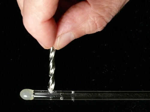 Agujerear los agujeros. Utilice una broca pequeña (alrededor de 1/16 pulgadas, 1,6 mm) y cuatro veces perpendicular al eje del tubo, para un total de ocho agujeros en la pared del tubo de perforación. Lugar el primer agujero en el extremo interior de la gota de epoxy. Así más tarde en allí no será fondo de saco duro-a-limpia. Perfore a través de ambas paredes. No vaya demasiado rápido; tubería rígida a veces puede ser un poco frágil. Cuando se hacen los agujeros, un poco un poco más grande entre el pulgar y los dedos y los bordes de los agujeros del avellanador. Este refinamiento demuestra apenas, pero lo hace más confortable la sonda cuando esté en uso. Después de taladrar y avellanar, virutas pueden eliminarse mediante la ejecución de un limpiador de pipa y tanto la longitud del tubo y también los pequeños orificios laterales.