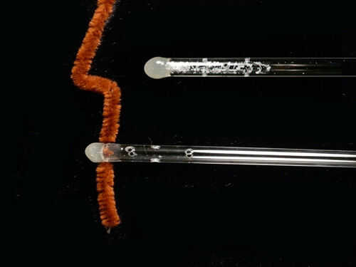 La sonda se une al extremo interior del codo protector contra salpicaduras con una longitud corta (de 2 pulgadas (5 cm) o menos) de tubería flexible de silicona o goma. Si todo funciona bien, se acoplará un trozo del mismo tubo. De lo contrario puede que necesite un poco de una tubería de tamaño diferente, o más gruesa pared tubería, para realizar la conexión. Para adultos, el extremo de la sonda debe extenderse alrededor de 4 1/2 pulgadas (11,5 cm) más allá de las partes verticales de los bloques de extremo.