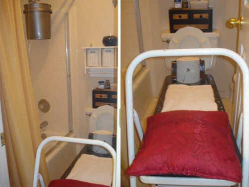 Cuando se utiliza el todos cinco galones, verá burbujas ir a través de la tubería; cuando, Levanto, limpie y lave el inodoro. Limpiar el equipo; tomar una ducha. Enjuague la sonda con agua, cuelgue el tubo para que el agua se salga y almacenar con la pinza abierta. No quiero poner una presión en la tubería. Usted puede experimentar aumento de la micción después de la limpieza. Podría tener que hacer otro movimiento de intestino. Lo que sea.