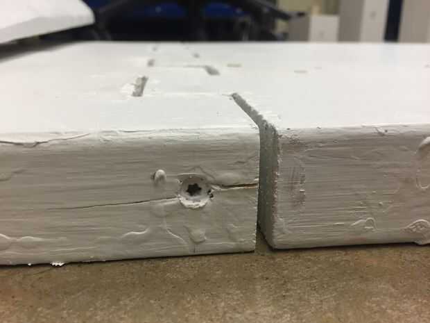 Lo mismo para la otra tabla corta y larga y colóquelos en sus lados al lado de la primera serie para que todas las muescas apropiadas alineen. Marcar punto equidistante en grosor y longitud para cada sistema y utiliza el taladro y 3 1/2" cubierta tornillo a través de dos dientes para cada conjunto de tablas.