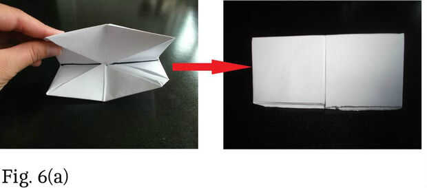 Desplegar el rectángulo y luego doblarlo por la mitad otra vez perpendicular del pliegue anterior. Los pliegues forman una cruz en el centro. Ver Figura 6. Estamos haciendo esto para facilitar el movimiento de la final en plena.