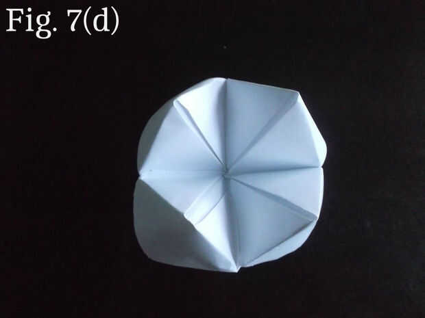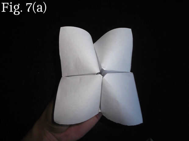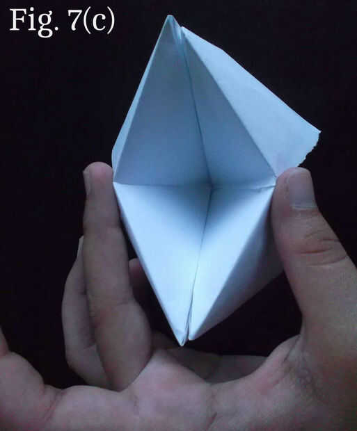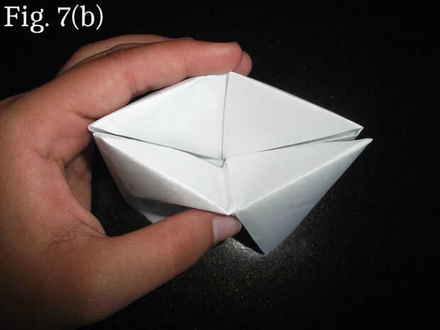 Ponga sus dedos debajo de las hojas exteriores de la Plaza doblada. Ver Figura 7 (a). Sus dedos se mueven en direcciones verticales y horizontales. La vista superior cuando estira horizontalmente y verticalmente debe parecerse Fig. 7 y Fig. 7.