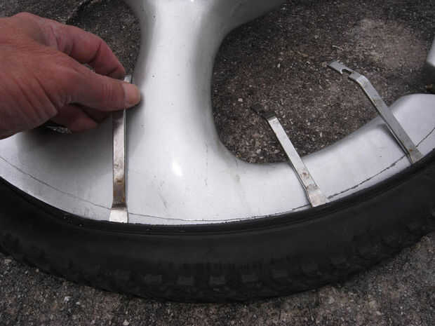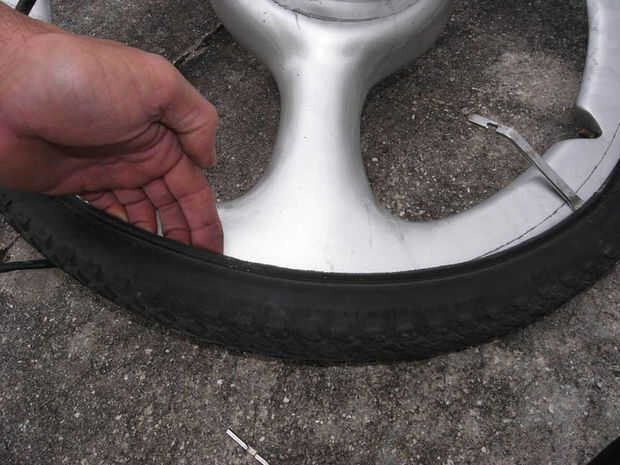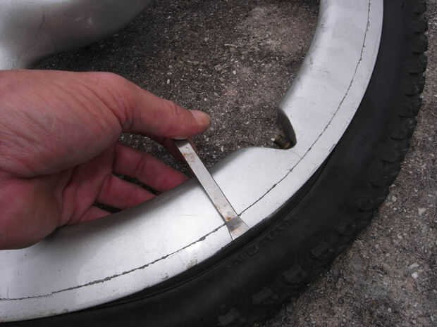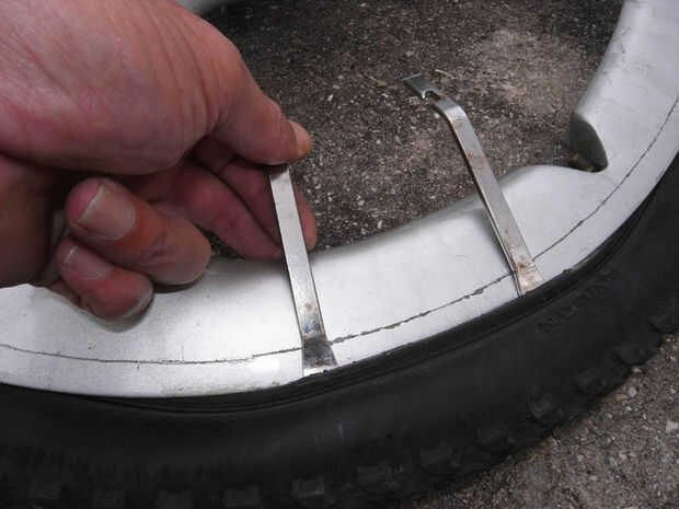 Inserte la llave ancho lateral de la llanta - pala el grano del neumático y tire de él sobre el borde.