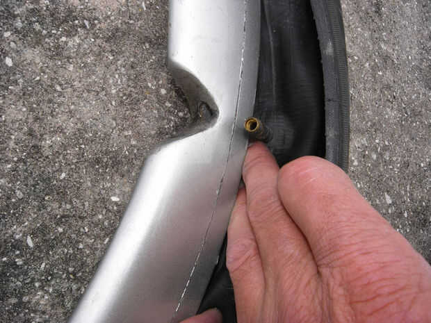 -tirando de la válvula del vástago por el borde hacia el interior de la llanta hasta que borra el borde.