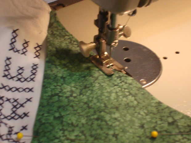 Me volví hacia abajo un dobladillo de 1/4 de pulgada solo en tres lados de la tela bordada blanca dejando solo el borde inferior. Se obtendrá bajo la frontera y cosido.