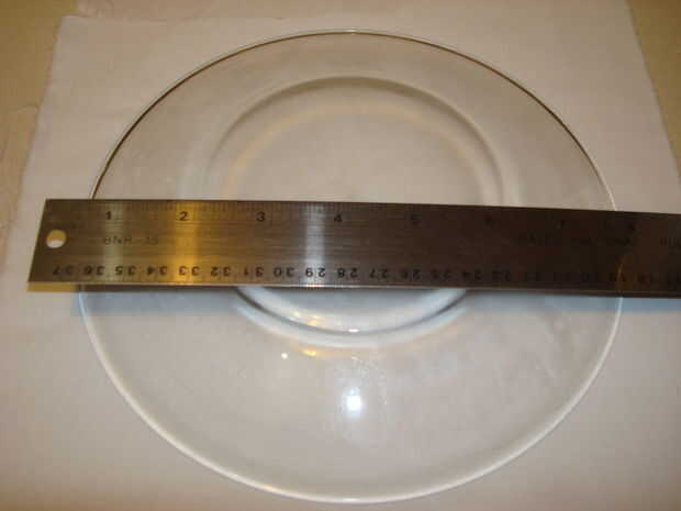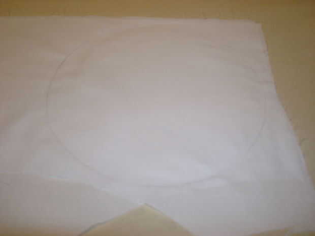 corté (círculos y cuadrados) de la tela de algodón suficientemente grande como para caber correctamente en el bastidor con tela extra que cuelgue por los laterales.  El tamaño del patrón de transferencia utilizado determinará el tamaño del aro que se necesita.    Usé una clara redonda plato para dibujar el círculo.  Trabajó muy bien. Para la Plaza he utilizado una regla para trazar las líneas y cortar hacia fuera.