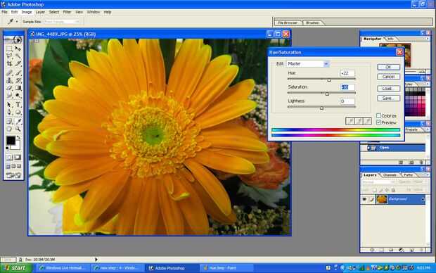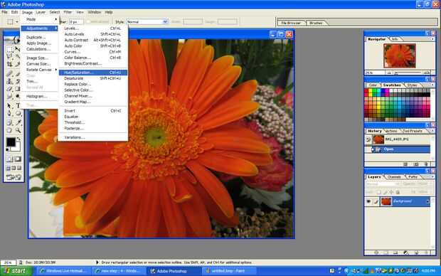 Ahora, para cambiar el color, haga clic en imagen en la parte superior, ajustes, a continuación, tono/saturación. Usted puede ensuciar con los colores ahora. Lo que hice fue cambió el color de la flor de naranja a amarillo (Hue: 22; Saturación: 16). Ahora presione ok y guardarlo.