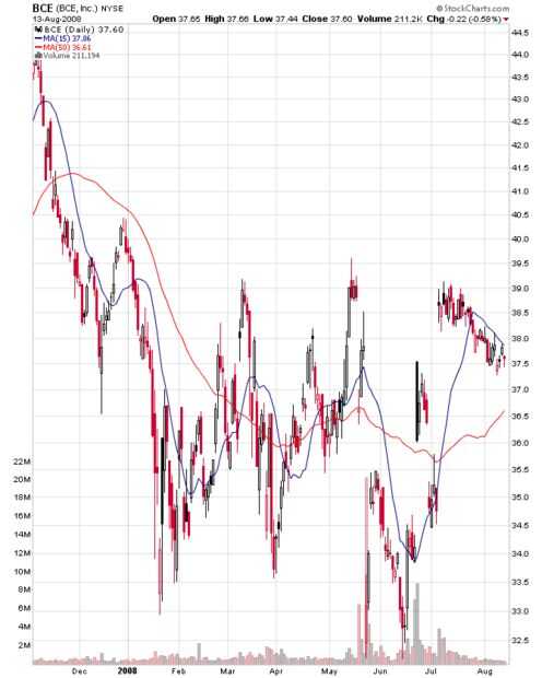 Sugerencia: aprender a leer cartas. Gráficos son mucho mejores que proporciones en el que le da una idea de lo que podría ser la próxima tendencia. Mire el cuadro de abajo (Foto 2). Esto es una carta de stockcharts.com. Muestra el precio diario para Bell Canada Enterprises (AEC) con un 15 días y un movimiento de 50 días promedio. Las intersecciones de las medias móviles son su compra y venden de indicadores. Como se puede ver, incluso esta táctica conduce a cierta incertidumbre. Esto no es una ciencia exacta, gente. Usted puede perder su camisa, su casa, su coche, su perro...