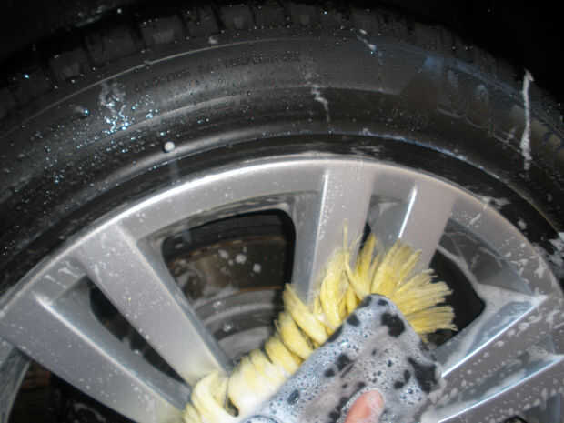 Esto debe tener cuidado en el 90% de la suciedad y polvo en las ruedas de freno y detalles de las llantas luego mucho más fáciles de hacer. Las cuatro ruedas del cepillo, les rocíe el jabón apagado con agua.
