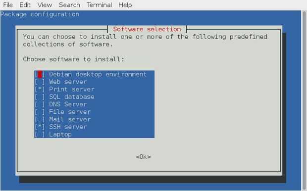 Tasksel es un programa limpio puesto que permitirá instalar una serie de programas para un propósito específico. Si sólo instalas el sistema base (línea de comandos), esto es una gran manera de agregar lo que usted necesita. De esa manera no tienes que ir willy nilly en busca de todo lo que miight ser necesario instalar un servidor web. Lo que está instalado varía según lo basado en Debian distro que utilizas. Esto es cierto incluso entre plataformas de hardware (es decir, X86, X86-64, Arm, PPC y etc.).