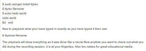 A veces de vez en cuando encontrará un viejo comando generalmente no utilizado, pero encontrará es muy valiosa. Un tal comando es conocido como ttyrec. Como su nombre indica, probablemente puede grabar lo que se escribe en la terminal. Esto es excelente para fines de documentación. Es una necesidad para la gente que hace cualquier cantidad de trabajo en la línea de comandos. Un ejemplo: recientemente hice una remota instalación de Arch linux en una máquina remota. Hubiera sido bueno tener un registro de todo el trabajo realizado.