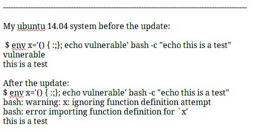 Es la salida de un sistema afectado (o parche): $ env x='() {:;}; Eco vulnerable' bash - c "echo esto es una prueba" bash: ADVERTENCIA: x: ignorando la función definición tentativa bash: error al importar la definición de la función de 'x' esto es una prueba