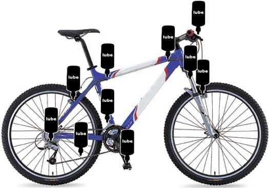 Mantener sus piezas de la bici correctamente limpiada y lubricada es crucial para el buen funcionamiento. Lubricación protege las partes móviles de un desgaste excesivo causado por la fricción, les impide "congelamiento," y ayuda a mantener óxido y la corrosión en la bahía. Pero ten cuidado. Demasiado lubricante puede llevar a bajo rendimiento y daños de componentes (lubricante exceso atraerá la suciedad y otras partículas abrasivas). Como regla general, lubricante sobrante debe siempre cuidadosamente limpiar lejos antes de montarse a la bicicleta. Consejo: Cuando Engrase un número de partes a la vez, recordar el orden en la cual se aplican los lubricantes. Limpiar el lubricante sobrante en el mismo orden dará la hora de lubricantes en remojo.