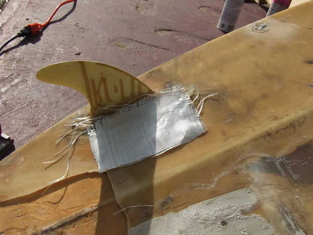 Una vez que estés feliz con tu sandjob, coloque la fibra de vidrio sobre la grieta y mezclar algunos epoxy. Gotear un poco encima de la fibra de vidrio y luego usando un pedazo de cartón, extienden el epoxi sobre la fibra de vidrio. Cuando la fibra de vidrio es 'mojado', debe ser transparente. No quiero mojar lo en epoxi, pero asegúrese de que obtener la pieza toda mojada y squeejee cualquier exceso.