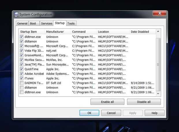 Ahora después de seleccionar la ficha 'Startup' usted verá una lista de todas las herramientas y programas que inicio cuando usted enciende su computadora. Para detener una marcha simplemente desmarque la casilla de verificación junto al programa. Sin embargo, se debe tener cuidado otra vez al seleccionar elementos que no reconoce. A veces me resulta útil a tomar el nombre de punto de inicio y búsqueda en Google.com a ver lo que es y si lo necesito. Hay sitios por ahí como processlibrary.com que le dirá si usted necesita un programa para su computadora funcionar normalmente.