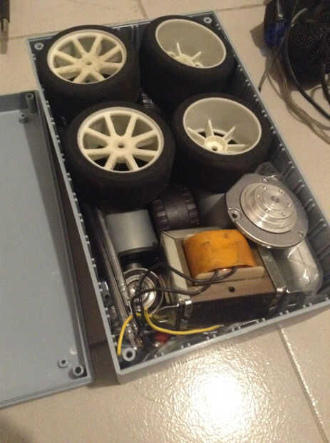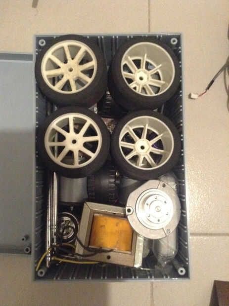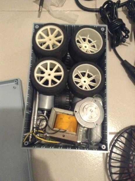 De nuevo, tengo esta caja de plástico con algunos motores y ruedas. Que solo ha añadido algunas otras cosas como el transformador y el motor del disco duro.