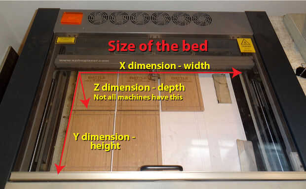 El tamaño de la cama de máquinas determinará cuán grande un pedazo de material que puede caber en la máquina para cortar o grabar. Una cama más grande te permitirá cortar o grabar piezas mas grandes y aunque tu hacer algo pequeño, como láser corte joyas, permitirá una cama más grande para cortar varias piezas a la vez en lugar de uno en uno. También algunas máquinas tienen un lecho fijo y algunas tienen una cama que puede ir hacia arriba y hacia abajo. Una cama que va hacia arriba y hacia abajo le permite grabar objetos de tamaño diferentes. La profundidad de corte no cambia pero si quieres grabar un logo en un zapato de cuero en lugar de un pedazo plano de cuero, tener una cama que se puede bajar a recoger el zapato en la máquina es importante.