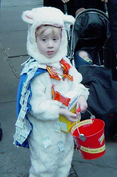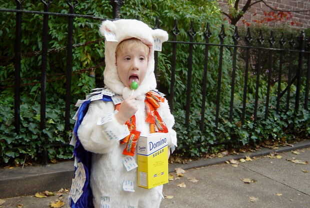 Mi hermana, que es una costurera mucho mejor que yo y mucho más dispuestos a gastar una cantidad obscena de tiempo haciendo los trajes, había hecho un traje de gato de gatito blanco hermoso para mi sobrina. Al año siguiente mi chico no le escuchamos de ser un lindo gato blanco, pero le gustaba la idea de ser "el monstruo de azúcar". Todo llevó fue un azul cabo paquetes de azúcar (vacío), algunos otros dulces (literalmente) decoraciones, y el mi hijo se convirtió en un monstruo de azúcar muy entusiasta. Nadie tiene, por supuesto, la idea era un poco demasiado abstracta, pero todavía tiene un montón de dulces.