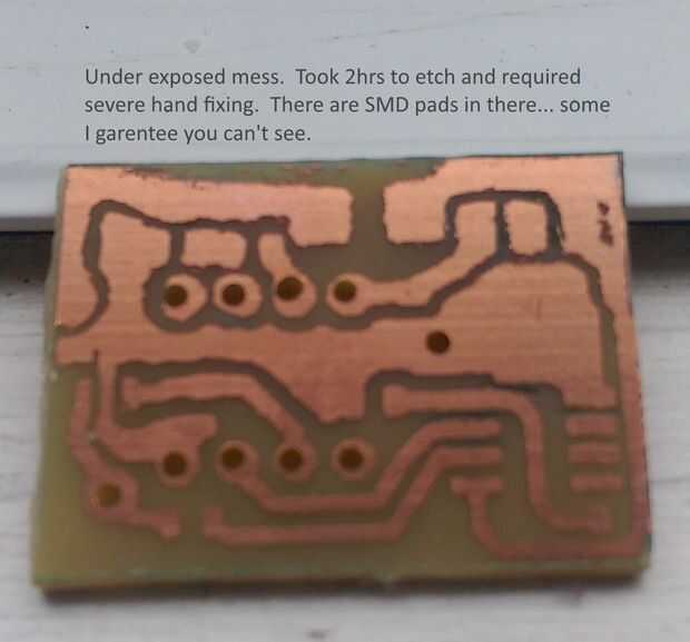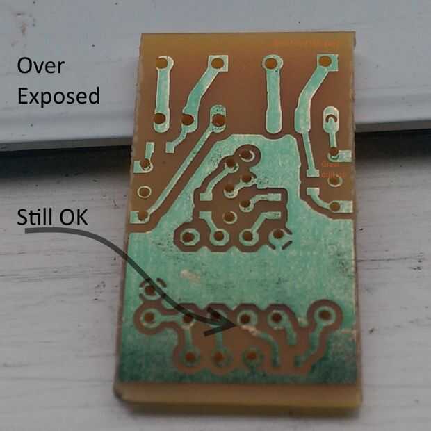 Cada junta mal grabado que he hecho fue bajo expuesto. Por supuesto usted puede verdaderamente sobreexposición, pero error en el lado de encima y no debajo de exponer, más fácilmente puede solucionar las lagunas que el cobre que no grabe. Por lo tanto mis instrucciones de la Junta previamente sensibilizadas sugieren 5-8 minutos. Para mi las bombillas fluorescentes, descubrí que realmente necesitaba 15.