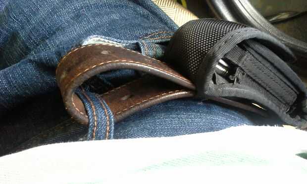 Así que use este tip para mantener todo en su lugar. Sólo el cinturón de vuelta el primer bucle de la correa del lazo y jam en el cinturón como en la imagen. Si el cinturón no es grueso o lo suficientemente rígido para un ajuste de fricción tal vez intente un nudo suelto o sólo la metiendo alrededor de sí mismo. Esto ha demostrado ser muy útil.