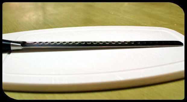 Así que ¿por qué importa el cuchillo? Bueno, grantons, esos pequeños óvalos en la lámina, romper la resistencia contra la hoja, permitiendo cortes más suaves con más control. Además, un buen cuchillo de corte tiene una punta redondeada, por lo que es menos probable que cortes poke en la carne y la pesca, producción irregular y poniendo sus dedos en riesgo. También debe tener un espesor ligeramente cónico y una hoja flexible, esto aumenta el control, hacer cortes delgados más fácil y seguro.