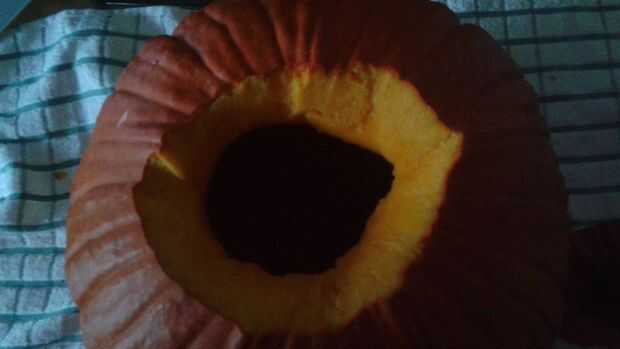 2. Limpie la calabaza. Utilizar mis manos para la primera capa de material, y había rematado con una cuchara. Me aseguré que no pastan la calabaza también mucho cuando con la cuchara ya que hace el esqueleto de la calabaza más débil y no durará más tiempo.
